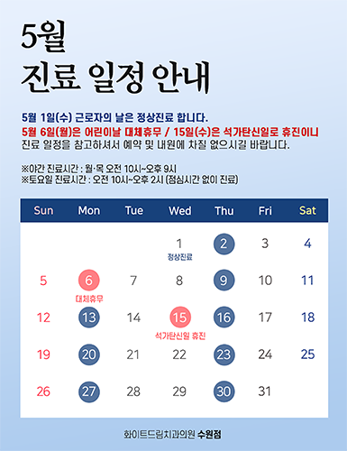 화이트드림[수원점] 2024.5월 진료안내 > 공지사항 | 수원화이트드림치과 : 수원치과 - 수원교정치과 - 수원임플란트