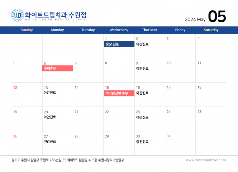 [ 화이트드림치과 수원점 2024.5월 진료안내 ]