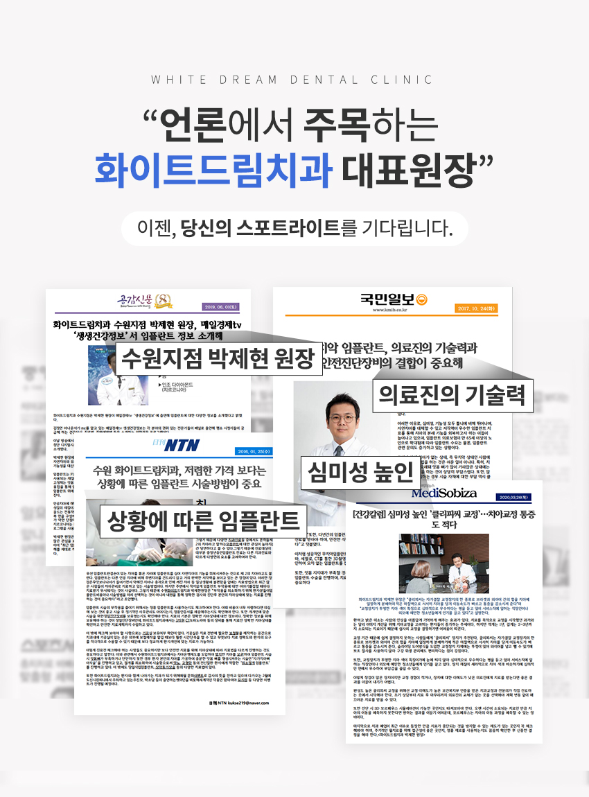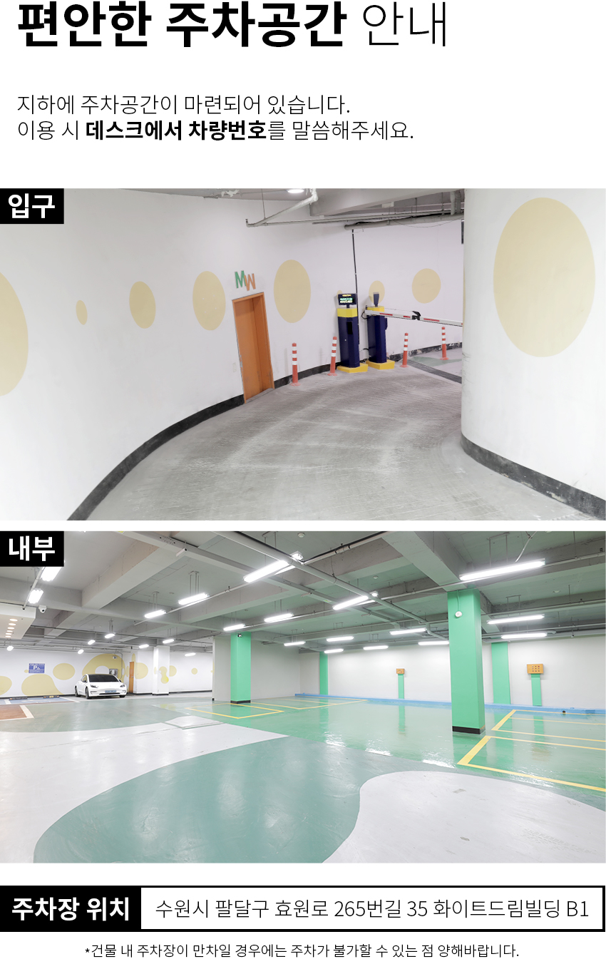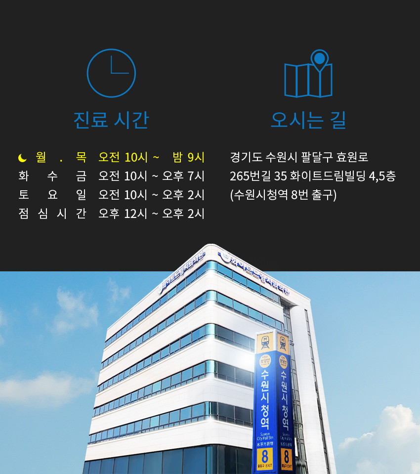 상호명 : 화이트드림치과 수원점 ㅣ 주소 : 경기도 수원시 팔달구 효원로 265번길 35 화이트드림빌딩 4,5층 (수원시청역 8번 출구 바로 앞 건물 4,5층)